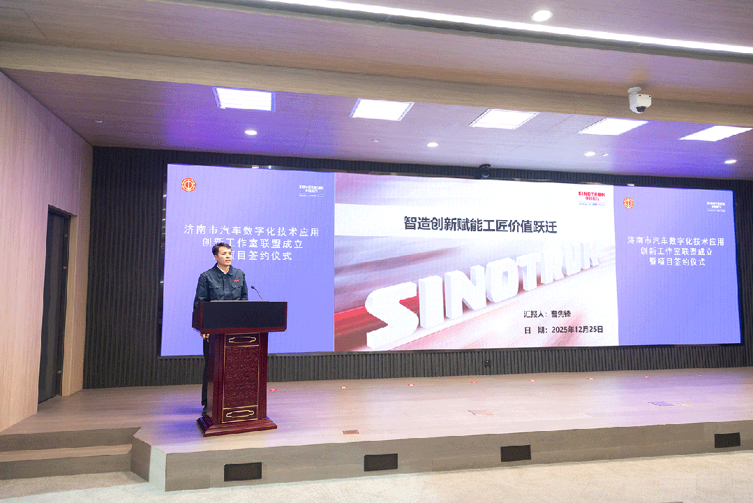To thoroughly implement the requirements of the reform on strengthening the industrial workforce in the new era and continuously improve the quality and effectiveness of the establishment of employee innovation studios, the establishment of the Jinan Automotive Digital Technology Application Innovation Studio Alliance and the project signing ceremony were grandly held at Sinotruk on December 25. Gong Junqing, Member of the Party Leadership Group and Vice Chairman of the Jinan Municipal Federation of Trade Unions, and Jiang Pengpeng, Deputy Secretary of the Party Committee, Director, and Chairman of the Labor Union of SINOTRUK, attended the ceremony and delivered speeches.