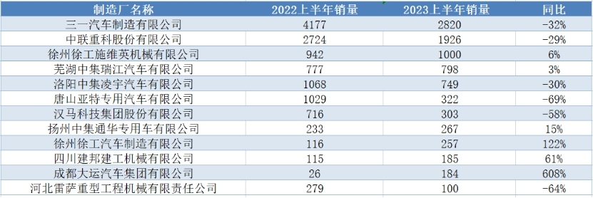 但位列前三甲的三一和中聯(lián)重科的銷(xiāo)量呈明顯下滑趨勢(shì),徐工施維英的銷(xiāo)量與2022年上半年相比小幅上漲。其中,成都大運(yùn)和徐工汽車(chē)的銷(xiāo)量漲勢(shì)喜人,同別分別增長(zhǎng)122%和608%。