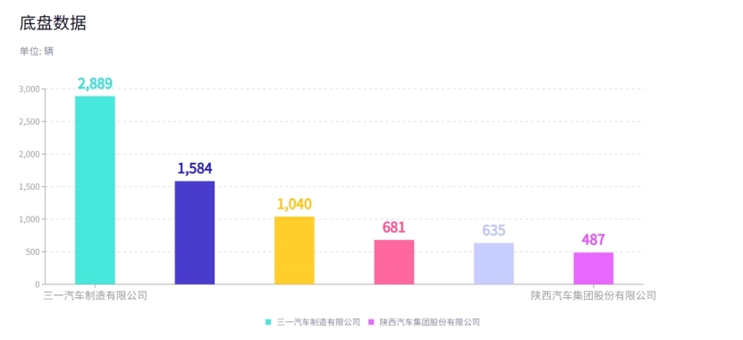 其中,三一以2889輛的銷(xiāo)量獨(dú)占鰲頭,占比29%。一汽和重汽銷(xiāo)量分別為1584輛和1080輛,占比16%和10%。