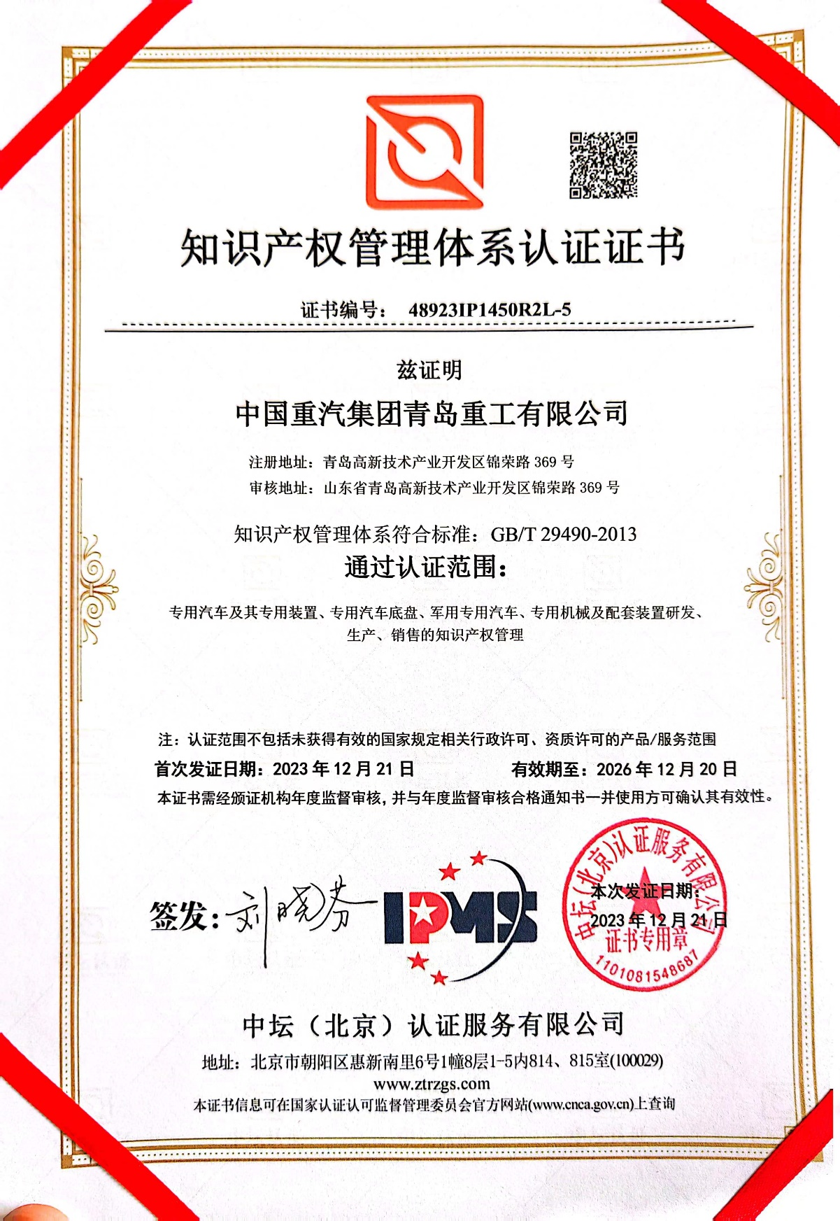 知識(shí)產(chǎn)權(quán)管理體系認(rèn)證證書