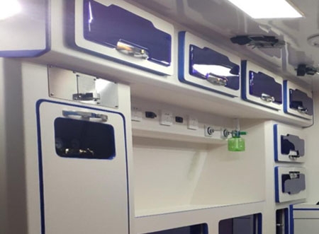 Cabinet Assembly The left side of the medical cabin features is designed with an overall cabinet, the cabinet body is made of PVC material, without sharp edges and corners. The oxygen cylinder cabinet is located at the rear of the medical cabin, which is convenient for replacing oxygen cylinders. A medical equipment platform is placed in the left cabinet. The upper part of the left cabinet is a medical supplies hanging cabinet. Visual cabinet doors are designed, which is convenient for quickly identifying the objects in the cabinet.