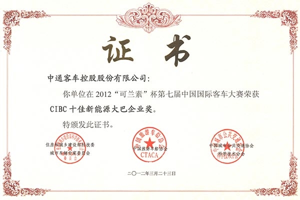 • Premio CIBC TOP 10 a la Empresa de Autobuses de Nuevas Energías del A?o 2012
